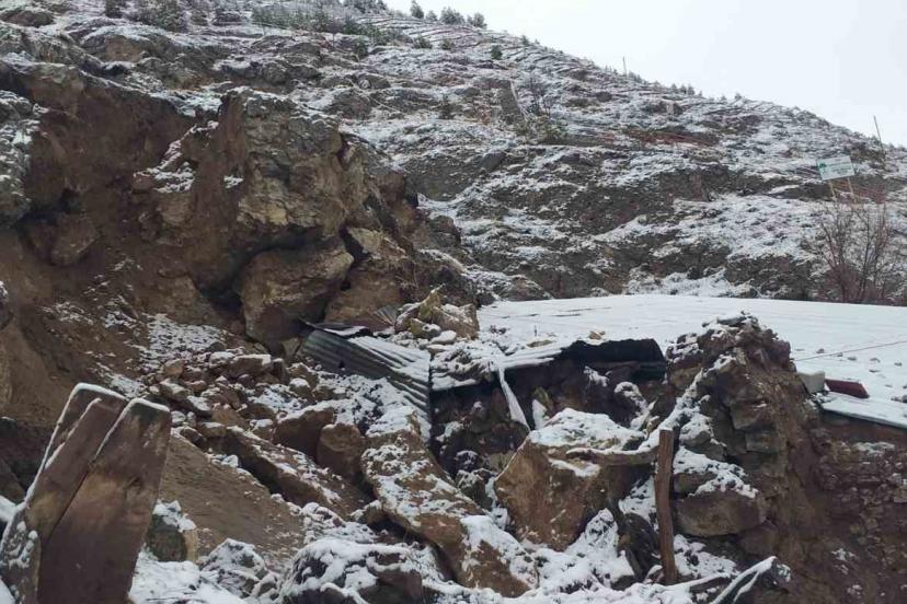 Sivas’ın Zara ilçesinde yamaçtan kopan kaya parçaları hem köy yoluna hem de bir ahıra düştü.