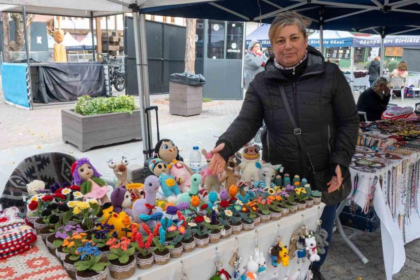 Çocukluk tutkusunu el emeğine dönüştüren ev hanımı Şükran Karol, soğuk havaya rağmen tezgahının başından ayrılmayarak rengarenk örgü çiçek ve oyuncaklarını vatandaşlarla buluşturuyor.