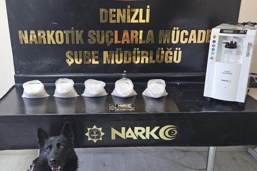 Denizli Emniyet Müdürlüğüne bağlı Narkotik Suçlarla Mücadele Şube Müdürlüğü ekipleri aldıkları istihbarat bilgileri doğrultusunda bir şahsın kente uyuşturucu madde getireceği bilgisine ulaştı. Narkotik timleri tarafından takibe alına şüpheli kadın, üzerinde ve eşyalarında yapılan aramalarda ise uyuşturucu maddelerin saklandığı yer pes dedirtti. Narkotik madde arama köpeğinin aramalar sırasında solunum cihazına tepki vermesi tüm dikkati o yöne çekti. Ekipleri kutusundan çıkarttığı solunum cihazının içine 5 kilogram metamfetamin gizlendiği belirlendi. Zehir taciri şüpheli kadın ise gözaltına alındı. Emniyetteki işlemlerinin ardından şüpheli çıkarıldığı mahkemece tutuklandı.