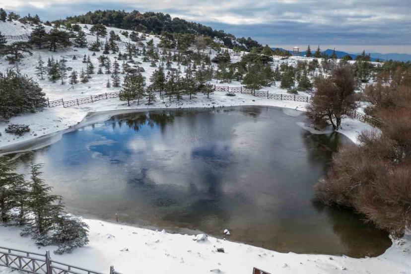 Manisa’nın bin 517 metre yüksekliğindeki Spil Dağı Milli Parkı, mevsimin ilk karının yağmasıyla beyaza büründü.