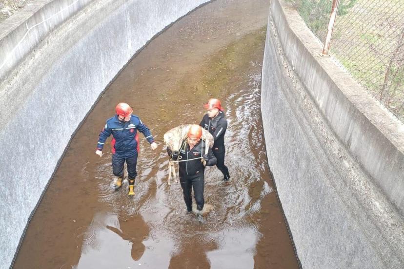 Su kanalına düşen karaca kurtarıldı, itfaiye eri metrelerce omzunda taşıdı