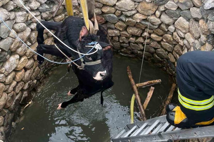 Su kuyusuna düşen inek itfaiye ekiplerince kurtarıldı