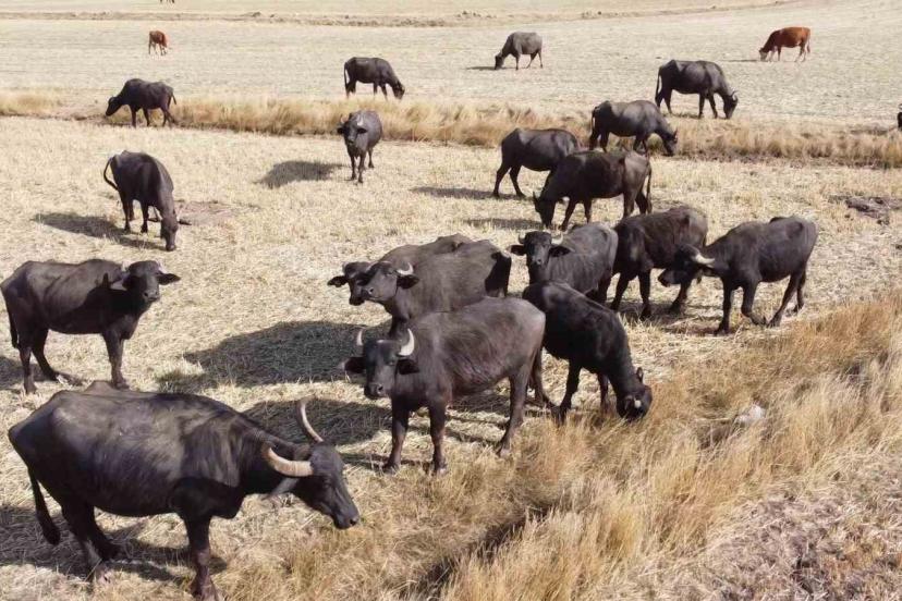 Suyu ve serinliği seven, sütüyle şifa kaynağı olan mandalar, Yozgat merkeze bağlı İşleğen köyünde hasat edilmiş tarlalarda yayılarak kışa hazırlanıyor.