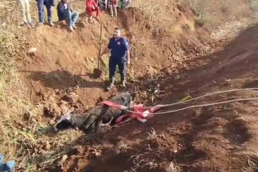 Şanlıurfa’nın Eyyübiye ilçesinde, tahliye kanalına düşen inek, itfaiye ekiplerince kurtarıldı.