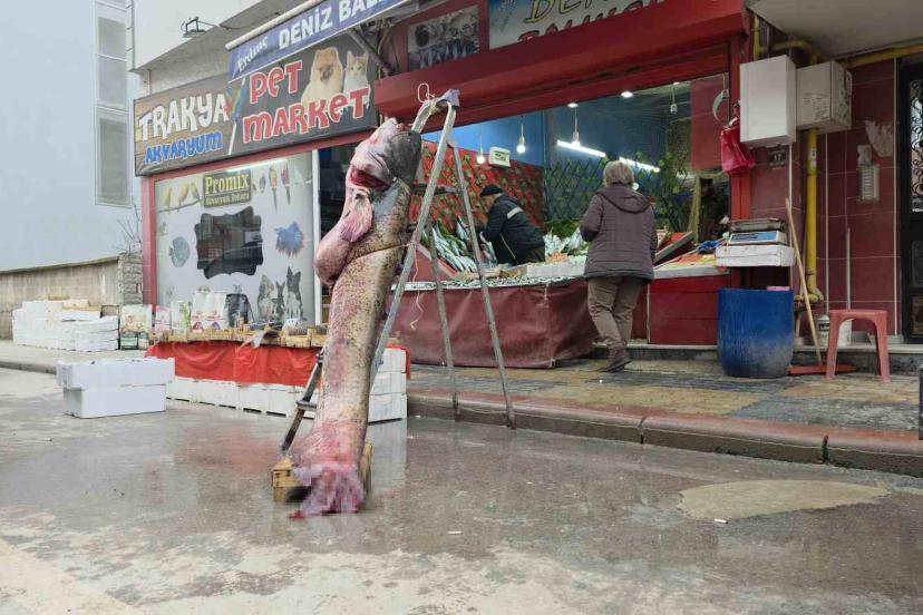 Edirne’de Meriç Nehri’nde son iki haftadır etkili olan taşkınlar ilginç bir görüntüyü de beraberinde getirdi. Yükselen suların ardından karaya vuran 2 metre 40 santimetre uzunluğunda ve 102 kilo ağırlığındaki dev yayın balığı, görenleri şaşırttı.