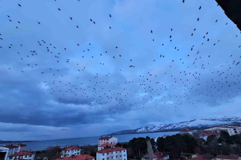 Bitlis’in Tatvan ilçesinde akşam saatlerine doğru gökyüzünde beliren binlerce sığırcık, izleyenlere görsel şölen sundu.