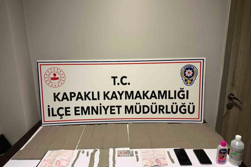 Tekirdağ Emniyet Müdürlüğü ekipleri, Kapaklı ilçesinde uyuşturucu içecek pazarlayan çeteye yönelik yaptığı operasyonda 3 şahsı yakaladı. Şahısların üzerinde ve iş yerlerinde yapılan aramalarda 1296 kullanımlık A-M emdirilmiş peçete, 2 plastik kutu içinde sıvı aseton, 8 adet Symra kapsül sentetik ecza, 5 adet 40x40 cm basıma hazır peçete ve suçtan elde edildiği değerlendirilen 13 bin 125 TL ele geçirildi.