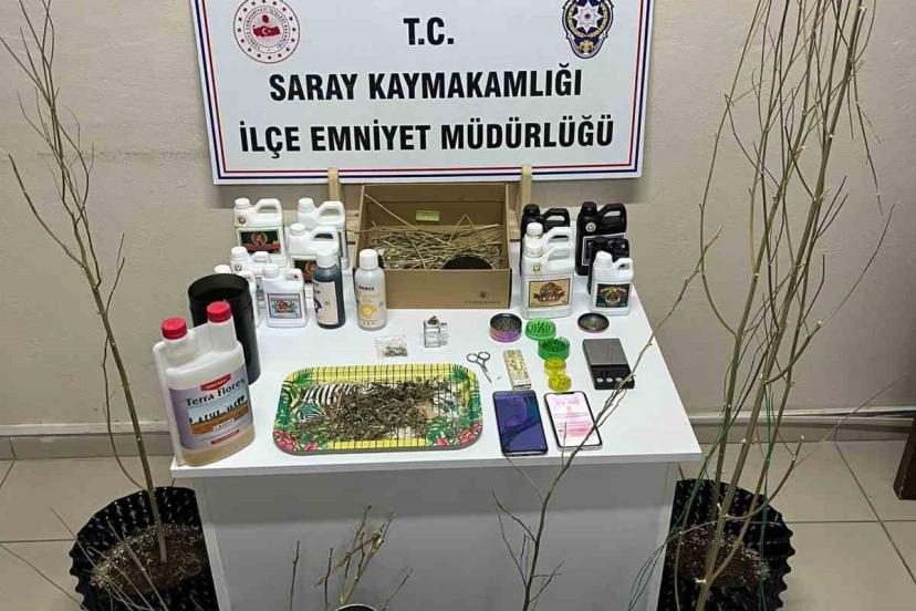 Edinilen bilgiye göre, Tekirdağ İl Emniyet Müdürlüğü Saray İlçe Emniyet Müdürlüğü ekiplerince yapılan iki ayrı çalışmada 1 adet bitki üretim kabini, 5 adet saksı içerisinde ekili kenevir bitkisi, 7 kutu suni sıvı gübre, 3 adet öğütücü, 1 adet hassas terazi, 14 gram hint keneviri, çeşitli bitki üretiminde kullanılan malzemeler, 4 adet ruhsatsız tabanca, 1 adet ruhsatsız tüfek ve 90 adet fişek ele geçirildi.