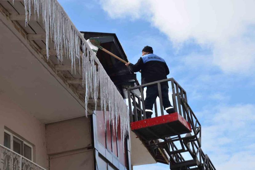 Soğuk hava şartları nedeniyle meydana gelen ve özellikle yayalar için tehlike oluşturan buz sarkıtları, ekiplerin kontrollü müdahalesiyle kırılarak kaldırıldı.