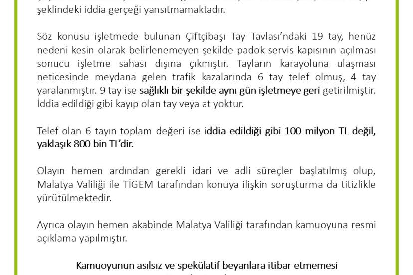 TİGEM’in sosyal medya hesabından yapılan açıklamada, "Genel Müdürlüğümüze bağlı Malatya Sultansuyu Tarım İşletmesi Müdürlüğü bünyesinde 25 Aralık 2025 tarihinde meydana gelen olayla ilgili, çeşitli mecralarda yer alan ’Değeri 100 milyon lira olan yarış atları kayıp’ şeklindeki iddia gerçeği yansıtmamaktadır. Söz konusu işletmede bulunan Çiftçibaşı Tay Tavlası’ndaki 19 tay, henüz nedeni kesin olarak belirlenemeyen şekilde padok servis kapısının açılması sonucu işletme sahası dışına çıkmıştır. Tayların karayoluna ulaşması neticesinde meydana gelen trafik kazalarında 6 tay telef olmuş, 4 tay yaralanmıştır. 9 tay ise sağlıklı bir şekilde aynı gün işletmeye geri getirilmiştir. İddia edildiği gibi kayıp olan tay veya at yoktur. Telef olan 6 tayın toplam değeri ise iddia edildiği gibi 100 milyon TL değil, yaklaşık 800 bin TL’dir. Olayın hemen ardından gerekli idari ve adli süreçler başlatılmış olup, Malatya Valiliği ile TİGEM tarafından konuya ilişkin soruşturma da titizlikle yürütülmektedir. Ayrıca olayın hemen akabinde Malatya Valiliği tarafından kamuoyuna resmi açıklama yapılmıştır. Kamuoyunun asılsız ve spekülatif beyanlara itibar etmemesi önemle rica olunur" denildi.