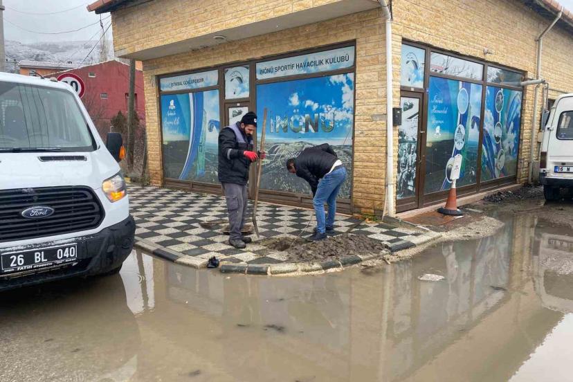 İnönü Belediyesi, ilçede su baskınlarına ve buzlanmaya neden olan tıkalı yağmur suyu giderlerini temizleyerek hem yaya hem de araç trafiğini güvenli hale getiriyor.
