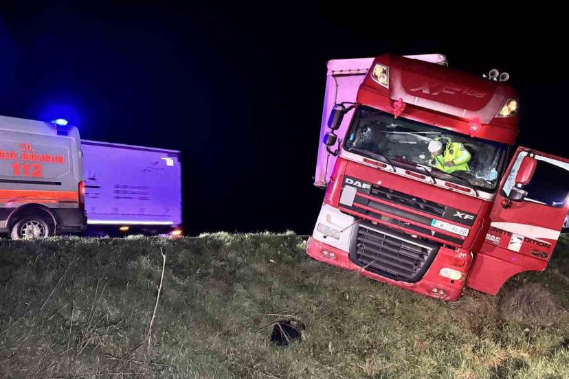 Edirne Hamzabeyli Sınır Kapısı yolunda kontrolden çıkan tır, şarampolün eşiğinde durarak devrilmekten son anda kurtuldu.