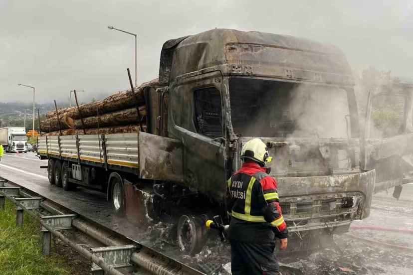 Aydın-İzmir Otoyolu üzerinde tomruk yüklü tır, alev topuna dönerken, yangın, itfaiyenin müdahalesiyle söndürüldü, tır ise kullanılamaz hale geldi.