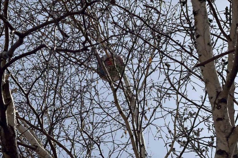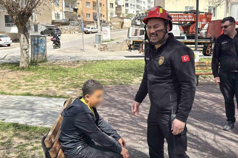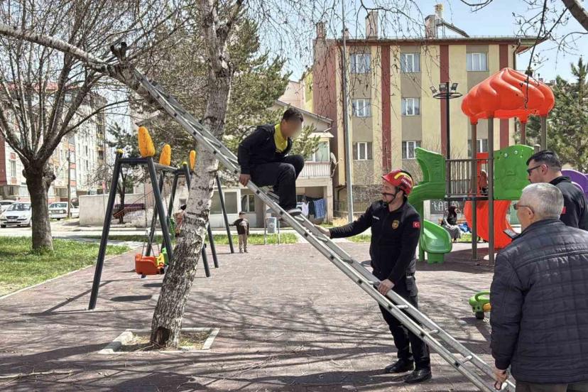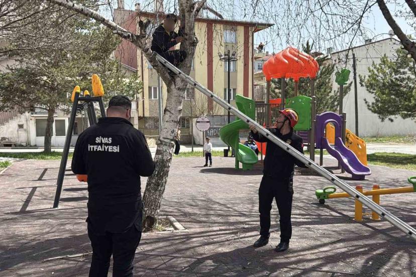 Sivas’ta dallara takılan topunu almak için ağaca çıkan çocuk inemeyince yardımına itfaiye yetişti.
