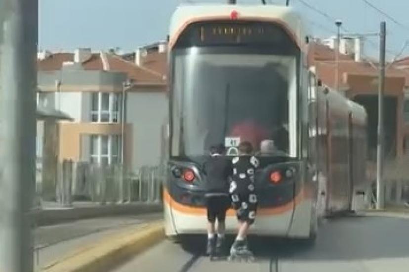 Eskişehir’de patenli 2 çocuğun tramvayın arkasına tutunarak yaptığı tehlikeli yolculuk kameraya yansıdı.