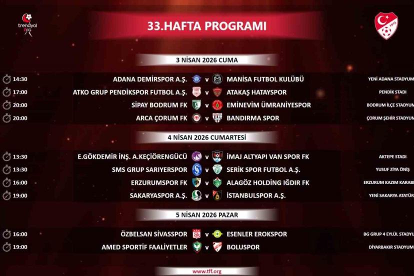 Türkiye Futbol Federasyonu (TFF), Trendyol 1. Lig’in 33, 34 ve 35. hafta programlarını duyurdu. 33. hafta 3 Nisan Cuma,4 Nisan Cumartesi ve 5 Nisan Pazar günleri oynanacak. 34. hafta ise 7 Nisan Salı, 8 Nisan Çarşamba ve 9 Nisan Perşembe günü gerçekleşecek. Açıklanan takvimde 35. hafta, 11 Nisan Cumartesi, 12 Nisan Pazar ve 13 Nisan Pazartesi günü sahne alacak.