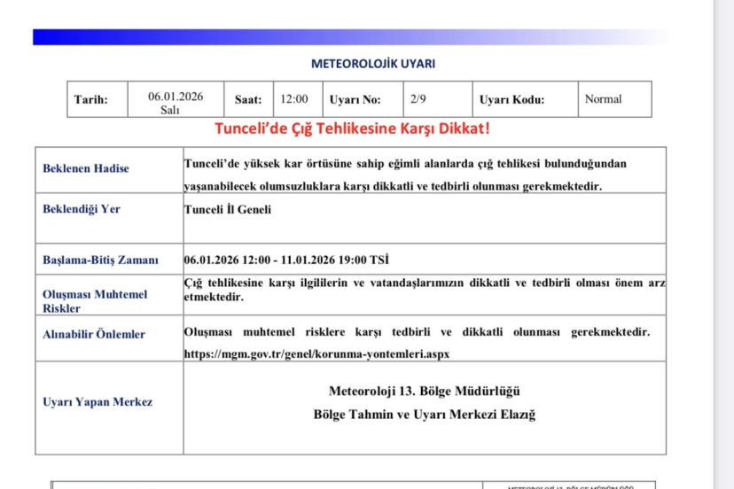 Meteoroloji 13. Bölge Müdürlüğü’nden yapılan açıklamada, " Tunceli’de yüksek kar örtüsüne sahip eğimli alanlarda çığ tehlikesi bulunduğundan yaşanabilecek olumsuzluklara karşı dikkatli ve tedbirli olunması gerekmektedir. Çığ tehlikesine karşı ilgililerin ve vatandaşlarımızın dikkatli ve tedbirli olması önem arz etmektedir" denildi.