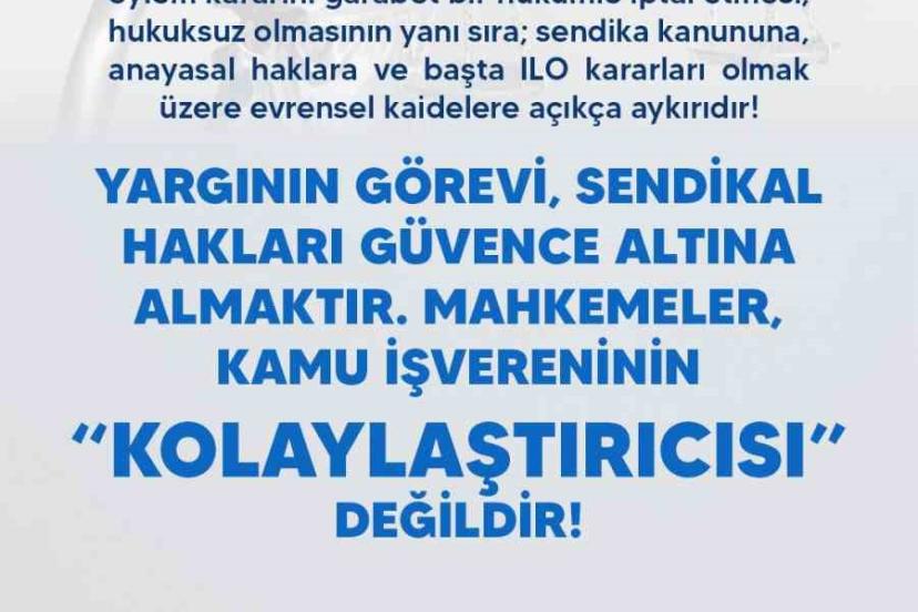 "Bugün ise görünen tablo, bu yükümlülüğün yerine getirilmediğini göstermektedir. Anayasal bir hakkın kullanımının iptal kararıyla fiilen imkansız hale getirilmesi, TCK 118 kapsamında düzenlenen ‘sendikal hakların engellenmesi’ suçunun yargı eliyle işlenmesi anlamına gelmektedir. Ankara 4. İş Mahkemesi’nin bu kararı açıkça sendikal eylemlerin kısıtlanması ve Milli Eğitim Bakanlığı’nın bundan sonraki süreçte sendikaların karar alma ve eylem yapma özgürlüğüne açıkça müdahale etme yolunu açmıştır. Milli Eğitim Bakanlığı Danıştay kararları doğrultusunda sendika üyelerini cezalandıramadığı için sendikamızı hedef alarak eylem kararını iptal ettirmiştir. Türk Eğitim-Sen bu sürecin sonuna kadar takipçisi olacaktır. Tüm hukuki yollara başvuruda bulunacak ve yanlış hesap Bağdat’tan dönecektir. Üyelerimizin gönlü ferah olsun, Türk Eğitim-Sen yıllardır verilen mücadeleler ile alınan birçok sendikal hakkın bir mahkeme kararı ile elimizden alınmasına asla müsaade etmeyecektir."