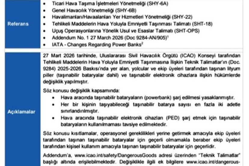 Sivil Havacılık Genel Müdürlüğü (SHGM), taşınabilir bataryalara ilişkin yeni bir Uçuş Operasyon Direktifi yayımladı. Yayımlanan direktif kapsamında, ICAO’nun teknik talimatlarında yapılan değişikliklerle birlikte yolcu ve ekip üyeleri tarafından taşınan lityum piller ile taşınabilir elektronik cihazlara yönelik yeni kurallar devreye alındı.