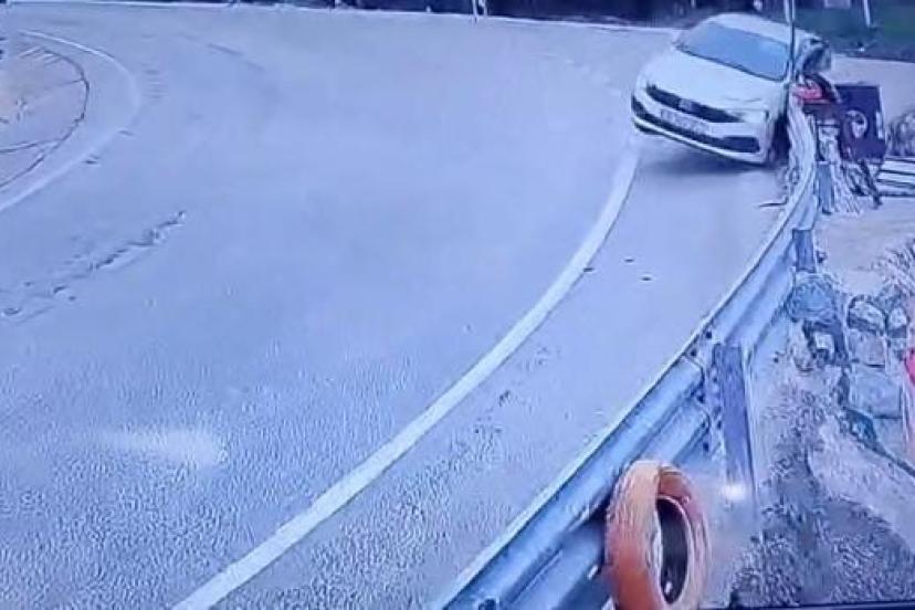 Uludağ yolundan şehir merkezine seyreden bir otomobil virajı alamayarak bariyerlere çarptı. O anlar güvenlik kamerasına yansıdı.