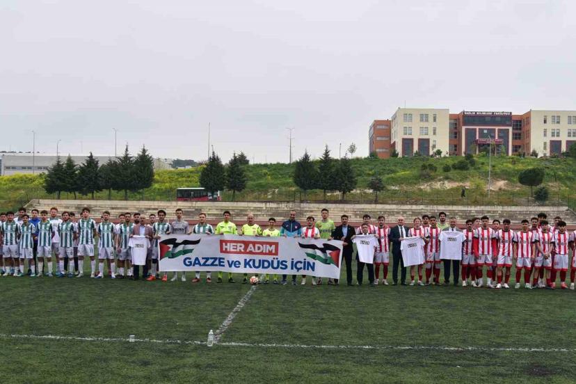 Alparslan Türkeş Stadyumu’nda oynanacak futbol karşılaşması öncesinde öğrenciler, sahaya mesaj içeren tişörtlerle çıkarak "Her Adım Gazze ve Kudüs İçin" yazılı pankart açtı ve Filistin’de yaşanan gelişmelere dikkat çekti.