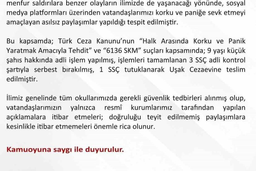 Uşak Valiliği sosyal medya üzerinden yapılan yazılı açıklamada, Şanlıurfa ve Kahramanmaraş illerinde okullara yönelik gerçekleştirilen saldırılara benzer olayların Uşak’ta da yaşanacağı yönünde sosyal medya platformları üzerinden vatandaşları korku ve paniğe sevk etmeyi amaçlayan asılsız paylaşımların tespit edildiği bildirildi. Söz konusu paylaşımlar üzerine başlatılan çalışmalar kapsamında yaşı küçük 9 kişi hakkında adli işlem yapıldığı belirtilerek, işlemleri tamamlanan 3’ünün adli kontrol şartıyla serbest bırakıldığı, 1’inin ise tutuklanarak cezaevine teslim edildiği kaydedildi.