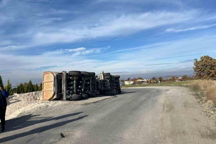 Uşak’ta yan yatan tırın sürücüsü yaralanarak hastaneye kaldırıldı.