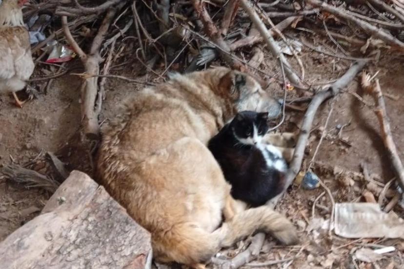 Üşüyen kedi ile köpek birbirine sığındı