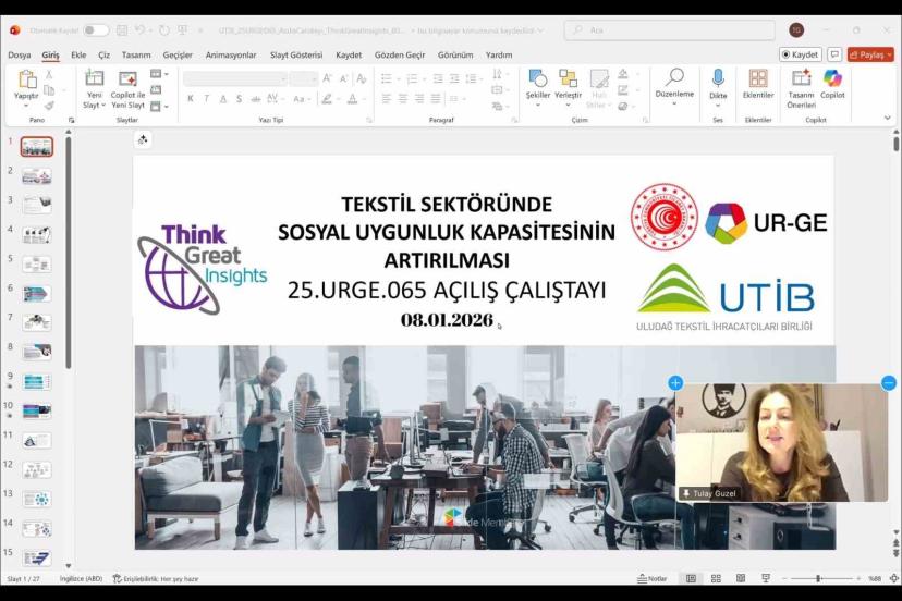 Dr. Güzel sunumunda, "UR-GE projelerinde oluşturulan ihtiyaç analizi raporu, firmaların sosyal uygunluk ve çevresel kapasite başta olmak üzere mevcut yapılarını doğru analiz etmelerine ve ihtiyaçlarına uygun bir gelişim yol haritası oluşturmalarına imkân tanıyor. Yapılan ihtiyaç analizi sayesinde firmalar; hangi alanlarda güçlenmeleri gerektiğini net bir şekilde görebiliyor, eğitim ve danışmanlık süreçlerini kendi önceliklerine göre şekillendirebiliyor. Sosyal uygunluk, sürdürülebilirlik, üretim süreçlerinin geliştirilmesi, tasarım ve trend odaklı yaklaşımlar ile dijital dönüşüm gibi birçok başlıkta planlanan danışmanlık ve eğitim faaliyetleri, firmaların kurumsal altyapılarını güçlendirirken ihracat pazarlarına daha hazırlıklı ve rekabetçi şekilde açılmalarını sağlıyor. Bu kapsamlı ve değerli sürecin hayata geçirilmesinde başta Ticaret Bakanlığımız olmak üzere, UTİB’e ve katkı sunan tüm paydaşlara teşekkür ediyor, süreci verimli ve uyum içinde gerçekleştireceğimize inanıyorum" ifadelerini kullandı.