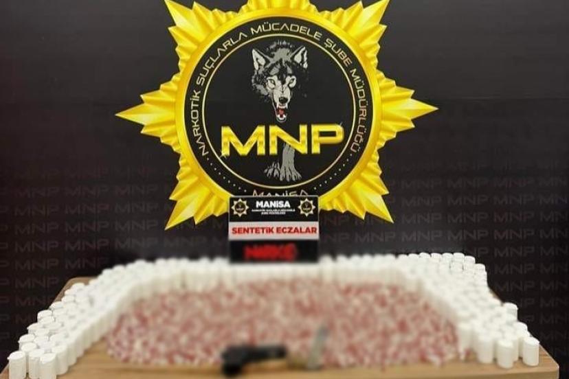 Manisa’da narkotik ekiplerinin düzenlediği operasyonda 10 bin 746 adet sentetik ecza hap ile birlikte silah ve fişek ele geçirildi.