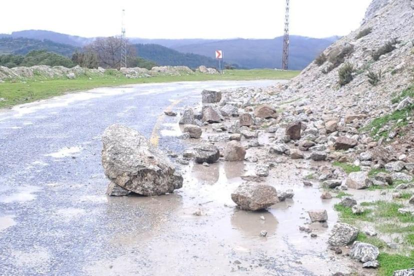 Aydın’ın Koçarlı ilçesinde etkili olan yağışlar sonrasında toprak kaymas meydana gelirken, düşen kaya parçaları yolu kapattı.