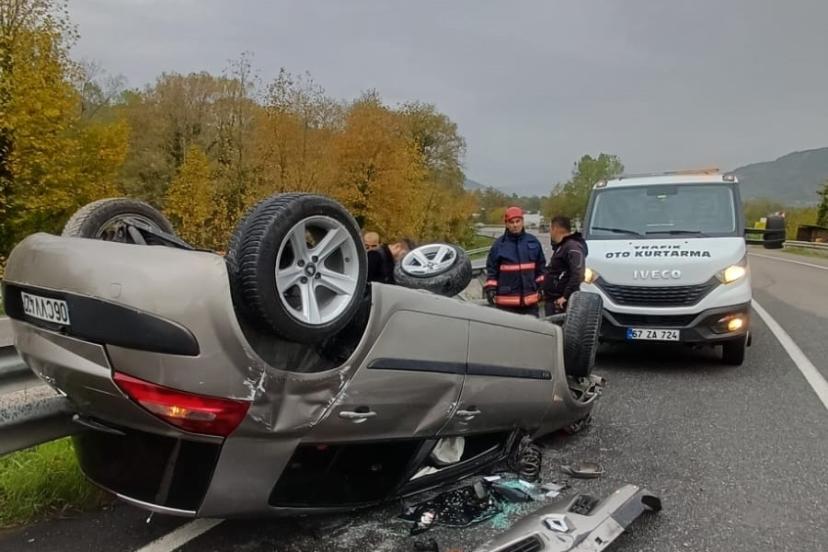 Zonguldak’ın Çaycuma ilçesinde meydana gelen trafik kazasında yolun ıslak ve zeminin kaygan olması nedeniyle sürücüsünün direksiyon hakimiyetini kaybettiği otomobil kontrolden çıkarak taklalar attı. Otomobil kaza sonrasında ters şekilde durabildi. Kazada iki kişi yaralandı.
