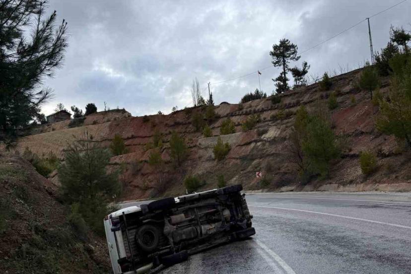 Yağmur sonrası kayganlaşan yolda pikap yan yattı