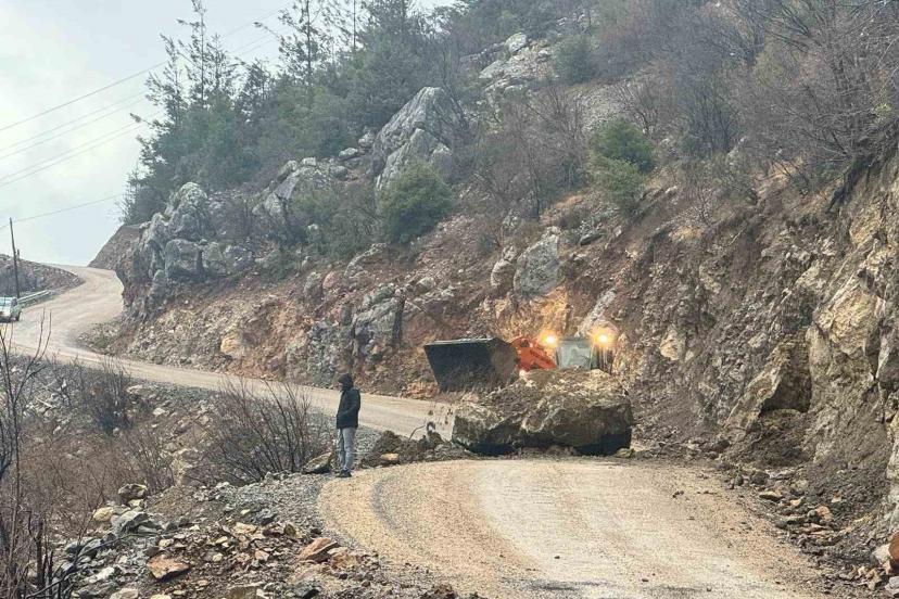 Feke Belediyesi’ne ait iş makinasının kaya parçasını yamaçtan aşağı sürüklemesiyle yol ulaşıma açıldı.