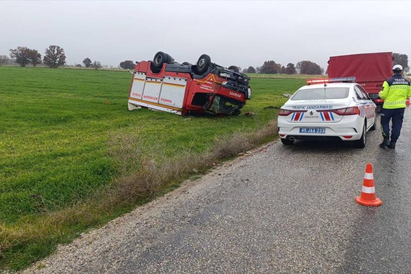 Manisa’nın Kula ilçesinde, yangına destek amacıyla yola çıkan itfaiye aracı sürücüsünün direksiyon hakimiyetini kaybetmesi sonucu takla attı.