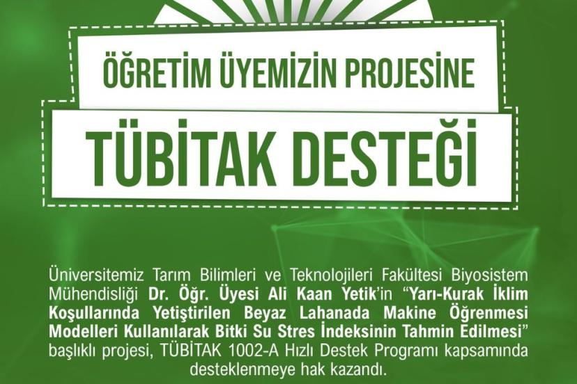 Niğde Ömer Halisdemir Üniversitesi Tarım Bilimleri ve Teknolojileri Fakültesi Biyosistem Mühendisliği Bölümü öğretim üyesi Dr. Ali Kaan Yetik’in "Yarı-Kurak İklim Şartlarında Yetiştirilen Beyaz Lahanada Makine Öğrenmesi Modelleri Kullanılarak Bitki Su Stres İndeksinin Tahmin Edilmesi" başlıklı projesi, TÜBİTAK 1002-A Hızlı Destek Programı kapsamında desteklenmeye hak kazandı.