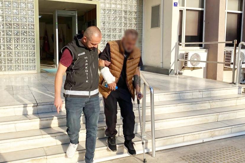 Aydın’ın Efeler ilçesinde gözaltına alınan 2 şüpheli sevk edildikleri adli makamlarca uyuşturucu madde ticareti yapmak suçundan tutuklanarak cezaevine gönderilirken, trafik kazası geçirdiği öğrenilen şüphelilerden biri koltuk değneği ile cezaevine gitti.