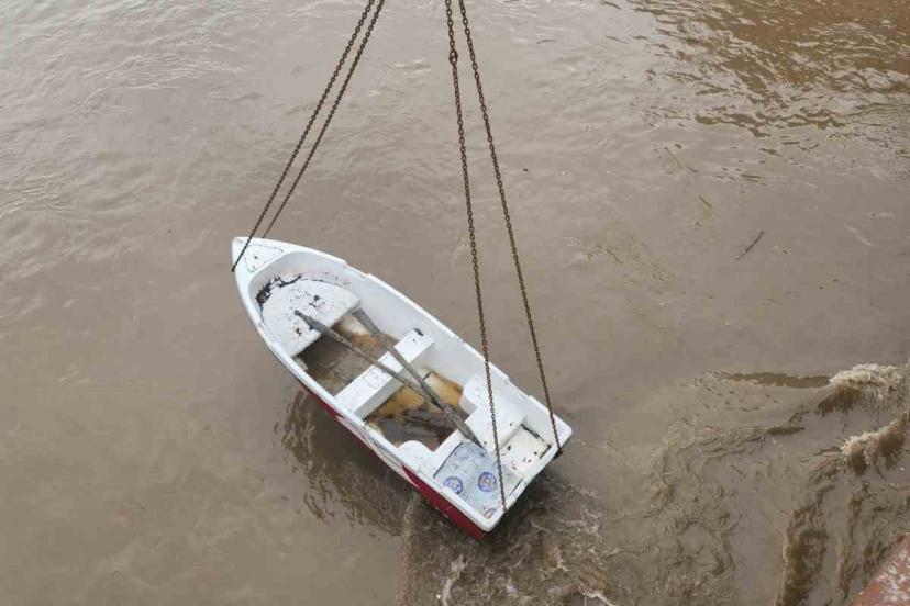 Amasya’da debisi yükselen Yeşilırmak Nehri’nde köprü ayağına takılan kayık vinç yardımıyla çıkartıldı.