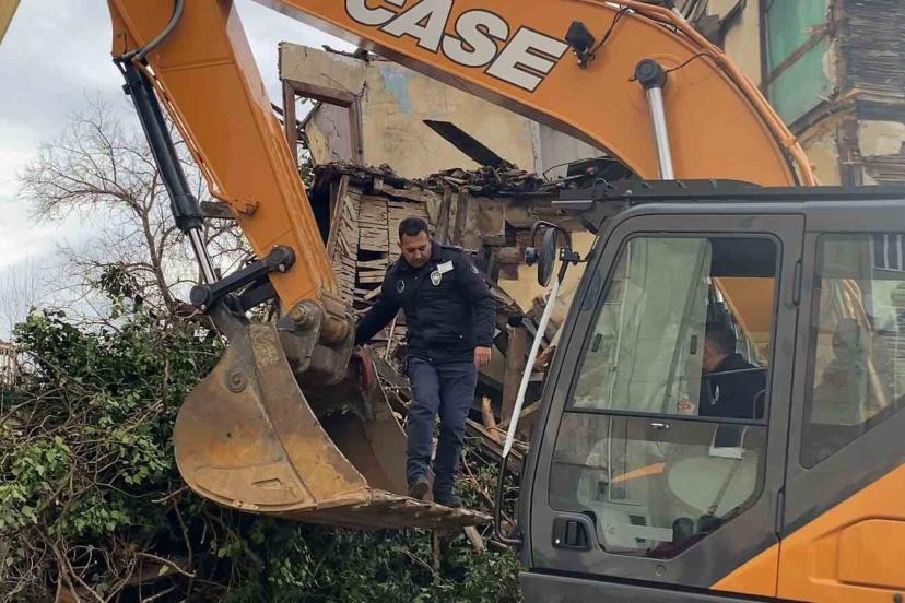 Bolu’da tehlike arz eden metruk binanın yıkımı sırasında duvarda asılı Türk bayrağını fark edince çalışmayı durduran ve iş ma...