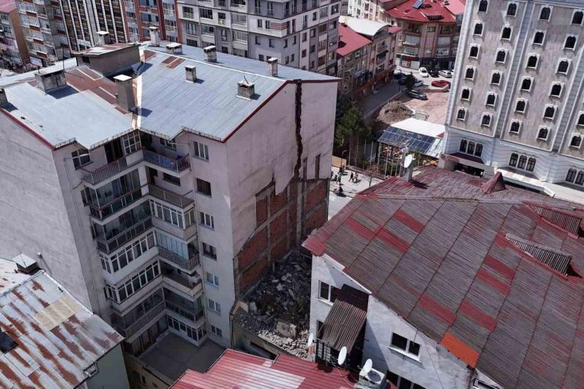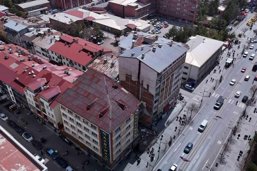Sivas’ta yaklaşık bir ay önce bir binanın yıkımı sırasında bitişikteki binanın kolonları zarar gördü. Ağır hasarlı olarak raporlanan 21 daireli bina tahliye edilirken, yapının son durumu dron ile havadan görüntülendi.