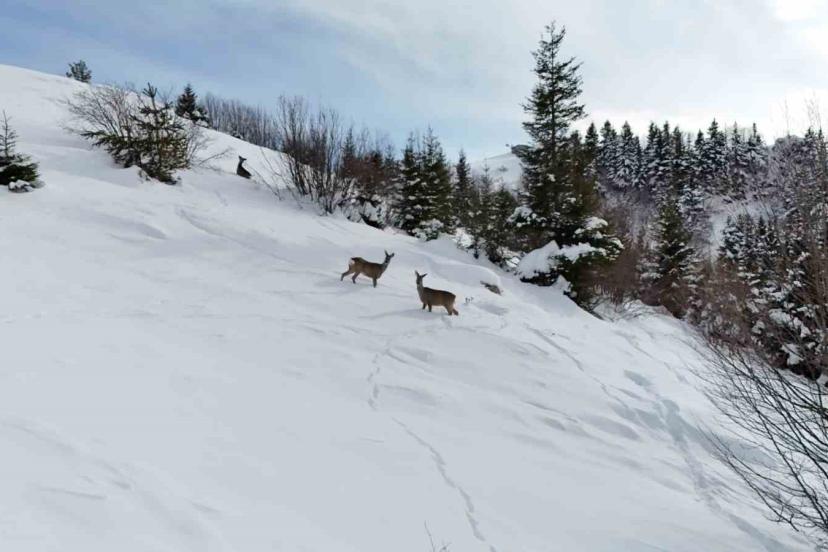 Yoğun kar yağışı sonrası sessizliğe bürünen yaylada ortaya çıkan karacalar, doğal yaşamın kış aylarındaki güzelliğini gözler önüne serdi. Kar örtüsü üzerinde besin arayan karacaların zaman zaman kara bata çıka ilerlediği, bazı karacaların ise dron kamerasını merakla takip ettiği anlar görüntülere yansıdı.