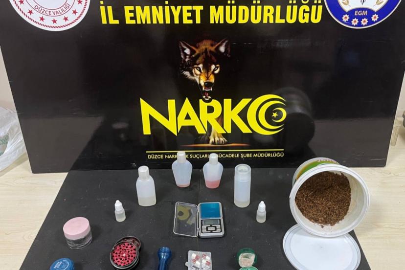 Düzce Cumhuriyet Başsavcılığı koordinesinde Narkotik Suçlarla Mücadele Şube Müdürlüğü ekiplerince Derelitütüncü Mahallesi’nde operasyon gerçekleştirildi. Yapılan operasyonda 1 parça halinde 75 gram sentetik kannabinoid maddesi, 4 gram a/m hamuru (400 gram bonzai yapılabilecek hammadde), 6 parça halinde daralı 200 gram sıvı sentetik kannabinoid maddesi, 3 gram esrar maddesi, 1 gram metamfetamin maddesi, 2 adet ectasy, 4 adet sentetik ecza ve 1 adet hassas terazi ele geçirildi. Yoğurt kovası içerisinde ele geçirilen uyuşturucu da dikkat çekti. "Uyuşturucu veya uyarıcı madde imal ve ticareti" suçundan işlem yapılarak gözaltına alınan Ö.B. (38) isimli şahıs sevk edildiği adli makamlarca tutuklandı.