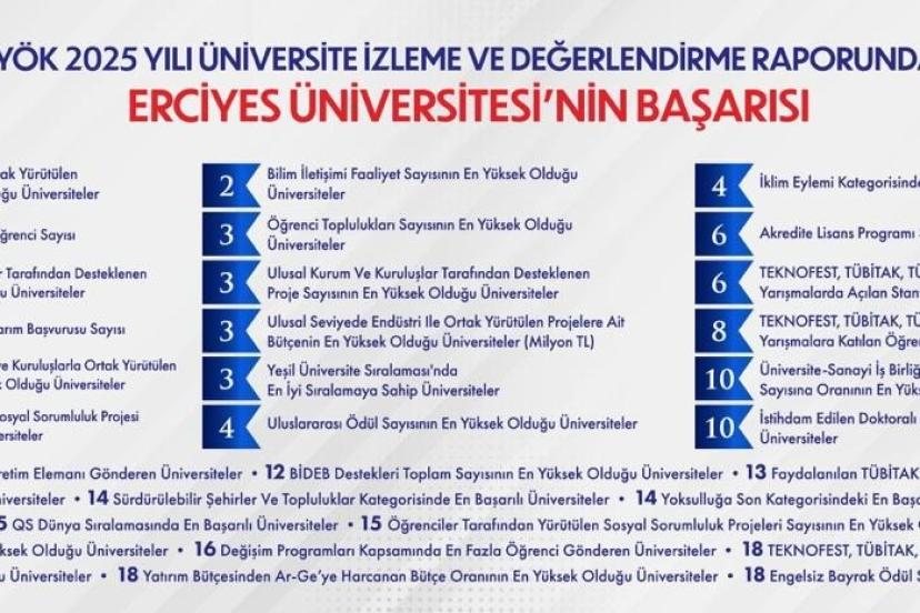 Erciyes Üniversitesi (ERÜ) 2 göstergede 1. sırada, 13 göstergede ilk 5’te, 18 göstergede ilk 10’da, 32 göstergede ise ilk 20’de yer alarak büyük bir başarı elde etti.